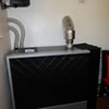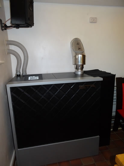 A brand new ETA PU15 (4.4 to 14.9kW) Wood Pellet Boiler System was installed within Mrs. Price living room in a 1200mm x 700mm space and finished with a dark leather cover to fit in with the room's decor. The system has a built in bulk loading vacuum system and weatherproof 240kG external wood pellet hopper.